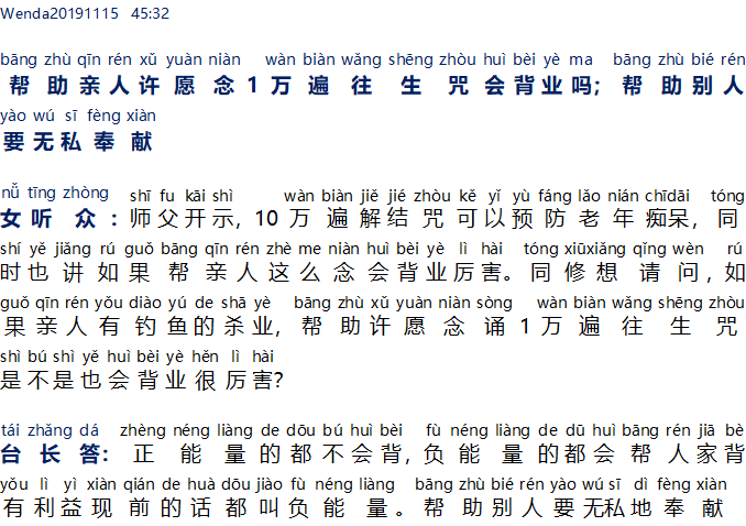 Pendengar wanita: Master memberi wejangan, 100.000 kali Jie Jie Zhou bisa mencegah Alzheimer atau pikun tua, pada saat yang sama, Master juga mengatakan bahwa membantu saudara untuk melafalkan paritta ini, akan memikul karmanya yang berat. Teman se-Dharma ingin bertanya, jika saudara memiliki karma pembunuhan dari memancing, membantunya untuk berikrar melafalkan 10.000 kali Wang Sheng Zhou, apakah akan banyak memikul karma buruknya yang berat?