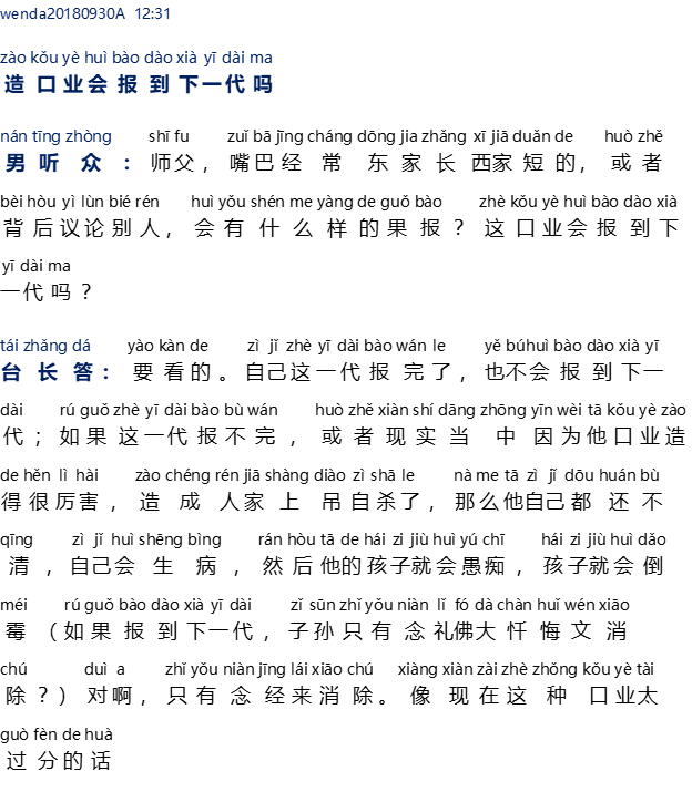 Pendengar Pria: Master, bagaimana balasan karma yang akan diterima oleh orang yang mulutnya sering gosip, atau mengomentari orang di belakang? Apakah balasan karma ucapan ini akan berlanjut hingga ke generasi berikutnya?