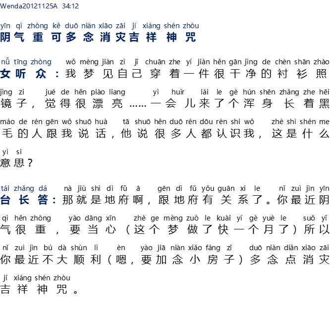 Wenda20121125A  34:12 — Aura “Yin” terlalu berat boleh perbanyak melafalkan paritta Xiao Zai Ji Xiang Shen Zhou