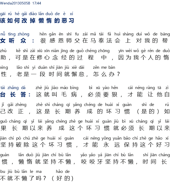 Pendengar wanita: Saya sangat berterima kasih kepada Master karena telah membantu saya di seminar Dharma Malaysia dan Thailand, tetapi dalam proses membina diri dan melafalkan paritta, karena kemalasan saya, saya selalu mengendur / malas untuk beberapa saat, apa yang harus saya lakukan?