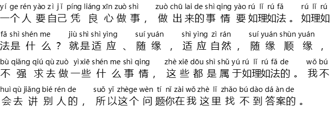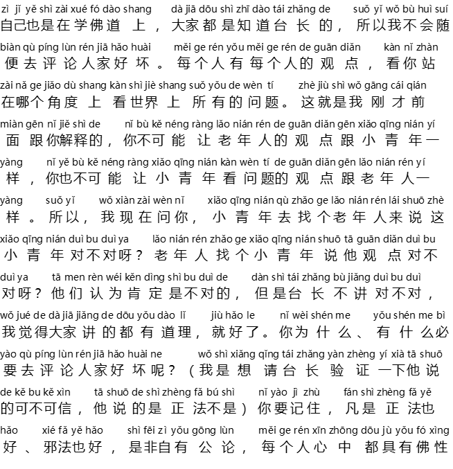Master menjawab: pertama, anda tahukan master bagaimana jadi orang, saya tidak pernah mengkritik dan berkomentar orang lain, kenapa saya menunggumu berbicara hingga selesai, karena Master ingin memperhatikan dan mendengarkan, mengetahui pemahaman anda sekarang terhadap ajaran Buddha Dharma sampai mana, agar saya bisa memahami lebih dalam. Tapi Master sendiri tidak akan sembarangan bicara. Karena apa? Master sendiri juga berada di atas perjalanan kebuddhaan, semua orang pada tahu Master, maka itu saya tidak akan sembarang berkomentar baik buruknya orang lain. Setiap orang punya pandangan sendiri, anda berdiri di posisi dari mana melihat semua masalah di dunia. Ini adalah yang tadi saya jelaskan pada anda di depannya, Anda tidak mungkin bisa menyamakan pandangan orang tua dengan pandangan anak muda, cara melihat masalah dari seorang anak muda juga tidak mungkin sama dengan orang tua, maka itu, saya sekarang tanya anda, anak muda mencari orang tua untuk membahas anak muda ini benar atau salah? Orang tua mencari seorang anak muda untuk membahas pandangannya benar tidak? Anggapan mereka pasti tidak benar, tapi Master tidak mengatakan benar dan salah, saya merasa yang dikatakan semua orang itu ada logika dan benarnya, itu sudah cukup. Kenapa anda harus mengomentari baik buruknya orang lain? (Saya ingin Master verifikasi perkataan dia bisa dipercaya atau tidak, yang dia katakan ajaran benar atau tidak?) Anda harus ingat: baik ajaran yang benar maupun buruk, akan ada opini publik, setiap orang hatinya memiliki sifat kebuddhaan, seseorang harus berdasarkan hati melakukan sesuatu, hal yang dikerjakan harus sesuai aturan dan ajaran Buddha Dharma. Sesuai dengan aturan dan ajaran Buddha Dharma apa maksudnya? yaitu harus menyesuaikan, menuruti jodoh, menyesuaikan alam, mengikuti jodoh, tidak memaksa melakukan suatu hal, beberapa ini termasuk sesuai dengan aturan dan ajaran Buddha Dharma. Saya tidak mengatakan orang lain, maka pertanyaan kamu ini, di tempat saya tidak akan ketemu jawabannya.