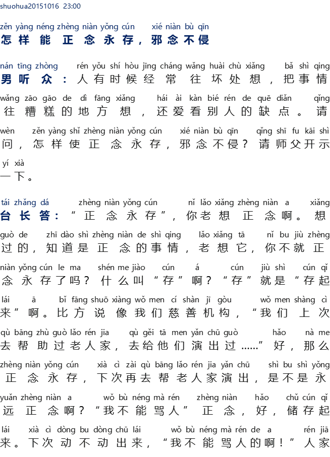 Apa yang dimaksud dengan “存 cun – simpan?” “Simpan” berarti “menyimpan”. Misalnya, seperti lembaga sosial kami ini, “kemarin kami pergi membantu para lansia, memberikan pertunjukan kepada mereka …” baik, lalu senantiasa berpemikiran yang benar. Lain kali akan pergi memberikan pertunjukan kepada mereka lagi, bukankah ini selalu berpemikiran yang benar? Seperti “Saya tidak boleh memarahi orang”, pemikiran benar, baik, diingat. Selalu mengingatkan diri sendiri “Saya tidak boleh memarahi orang!” Orang lain mengatakan Anda melakukan perbuatan buruk, “tidak boleh melakukan perbuatan buruk!” pikiran yang benar, diingat selamanya.