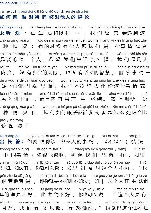 Shuohua20190208   17:38 – Bagaimana menyelaraskan terhadap komentar teman se-Dharma