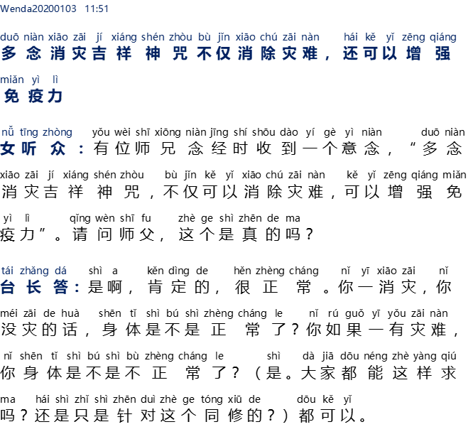 Banyak melafalkan paritta Xiao Zai Ji Xiang Shen Zhou tidak hanya untuk menghilangkan bencana, tetapi juga untuk memperkuat imun tubuh 多念消灾吉祥神咒不仅消除灾难; 还可以增强免疫力
