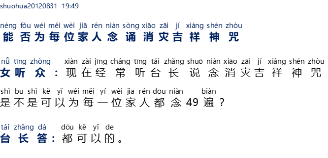 Pendengar wanita: Sekarang sering mendengar Master berkata untuk melafalkan paritta Xiao Zai Ji Xiang Shen Zhou, apakah boleh melafalkan 49 kali untuk setiap anggota keluarga?
