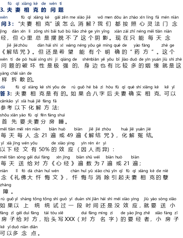 - Lafalkan {Li Fo Da Chan Hui Wen} untuk menyesali dan menghapus karma buruk yang menimbulkan ketidakcocokan di antara suami-istri.