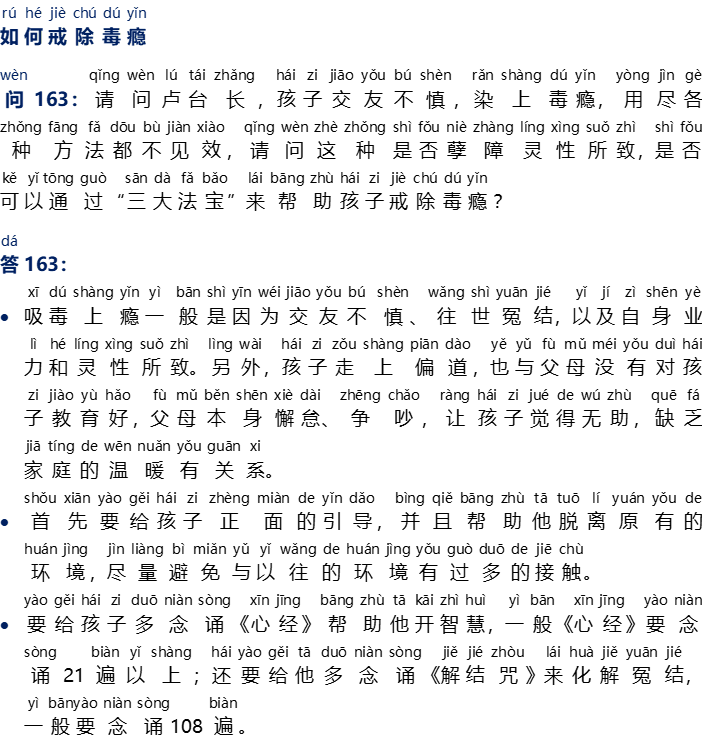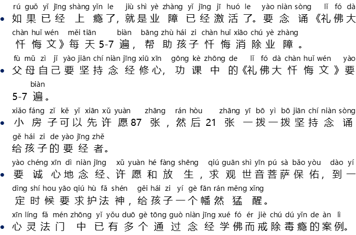 - Jika sudah kecanduan, berarti karma buruknya sudah matang. Harus melafalkan {Li Fo Da Chan Hui Wen} setiap hari sebanyak 5-7x, untuk membantu sang anak bertobat dan menghapus karma buruknya.