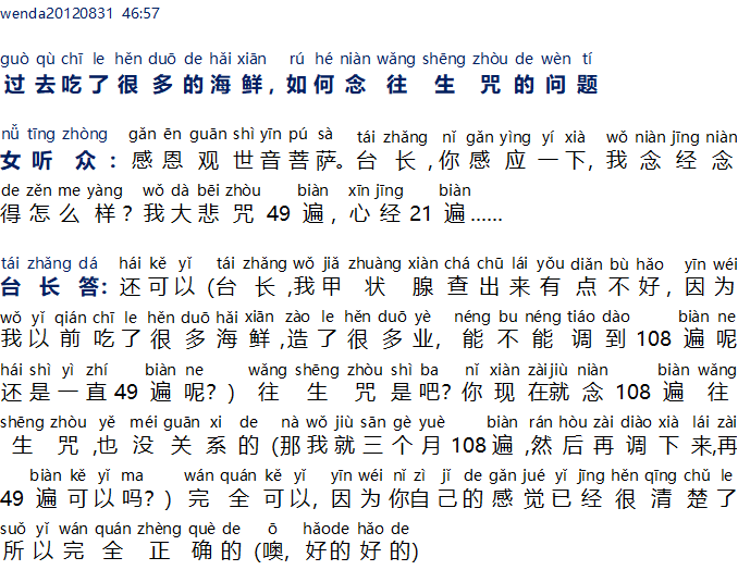 wenda20120831 46:57 – Di masa lalu telah makan banyak makanan laut, masalah tentang bagaimana cara melafalkan mantra Wang Sheng Zhou 过去吃了很多的海鲜, 如何念往生咒的问题