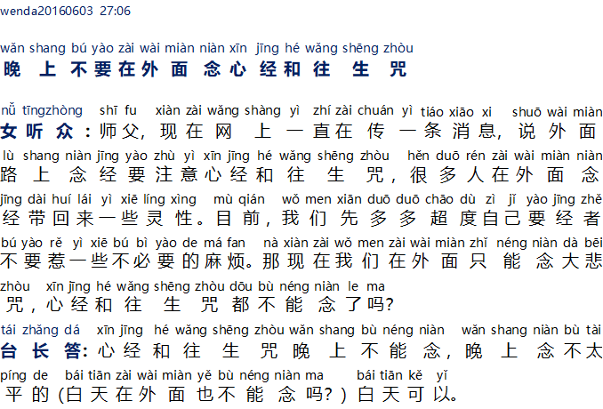 wenda20160603  27:06 – Jangan melafalkan paritta Xin Jing dan Wang Sheng Zhou di luar pada malam hari