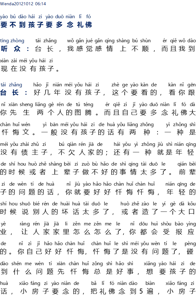 Master: Jika sudah beberapa tahun tidak punya anak,ini harus dilihat totemmu dan suami. Dan kamu harus perbanyak melafalkan Lǐ Fó Dà Chàn Huǐ Wén. Secara umum, tidak memiliki anak ada dua jenis: pertama tidak ada penagih hutang dan tidak berhutang pada orang lain; yang lainnya adalah terlalu banyak melakukan hal buruk ketika masih muda atau di kehidupan masa lampau.