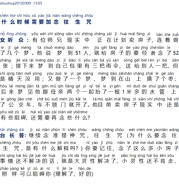 Pendengar wanita: Ada seorang saudara se-Dharma yang kenyataannya berencana untuk menjual rumahnya, dia berturut-turut bermimpi. Dia berkata bahwa dia bermimpi 51 orang, jadi dia membaca 52 lembar XFZ untuk penunggu rumahnya. Selanjutnya dia bermimpi ada tiga payung di dalam tasnya, dia memberikan satu payung kepada orang lain, tetapi hari cerah, tidak dipakai; lalu dia bermimpi lagi. Dia mimpi memetik sebuah kumar di atas gunung; Kemudian, dia bermimpi dengan ibunya mengangkat sebuah pipa air berukuran 1meter dan naik bus, bus berjalan tanpa mengunci pintu. Kenyataannya, dia sekarang masih memiliki beberapa kendala dalam menjual rumahnya, paritta apa lagi yang perlu dia bacakan?