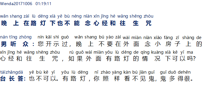 Pendengar pria: Master pernah memberi wejangan, tidak boleh melafalkan paritta Xin Jing dan Wang Sheng Zhou dalam XFZ di luar pada malam hari. Jika di luar ada lampu jalan, apakah itu boleh?