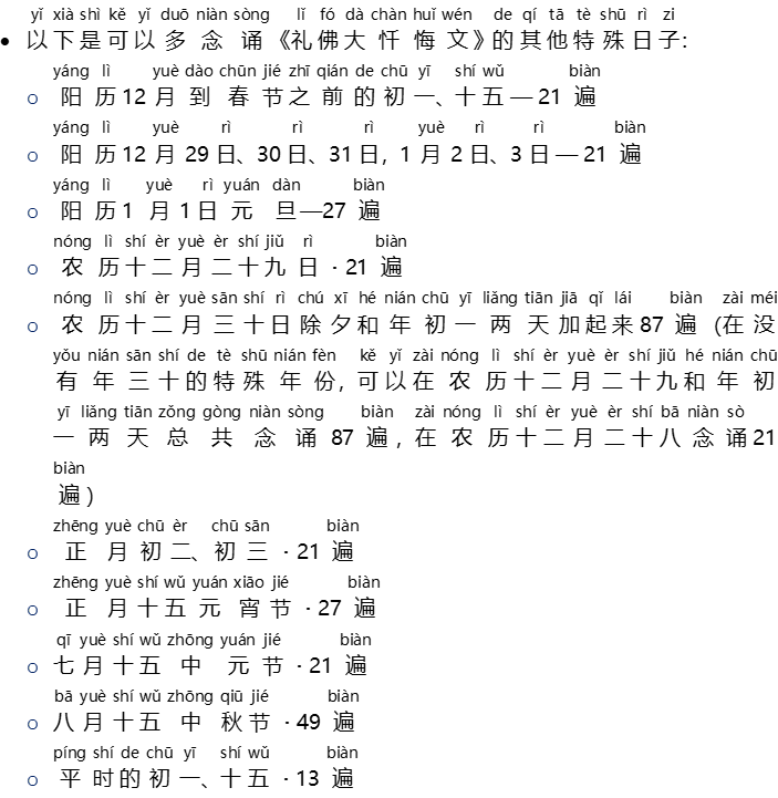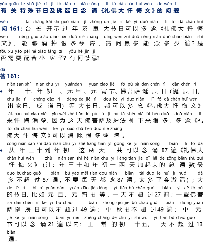 - Di malam tahun baru Imlek dan di hari tahun baru Imlek boleh melafalkan 87x {Li Fo Da Chan Hui Wen} (catatan: jumlah {Li Fo Da Chan Hui Wen} yang dilafalkan di kedua hari ini tidak boleh lebih dari 87x, bila melafalkan terlalu banyak, maka balasan karma buruk bisa teraktivasi lebih cepat); hari besar lainnya seperti tahun baru masehi, Cap Go Meh, bisa melafalkan tidak lebih dari 27x dalam 1 hari; beberapa hari kelahiran Buddha atau Bodhisattva bisa melafalkan tidak lebih dari 49x; festival musim gugur (zhong qiu jie) melafalkan tidak lebih dari 49x; hari raya Ulambana (zhong yuan jie), boleh melafalkan tidak lebih dari 21x; di setiap tanggal 1 dan 15 penanggalan lunar biasanya boleh melafalkan tidak lebih dari 13x.