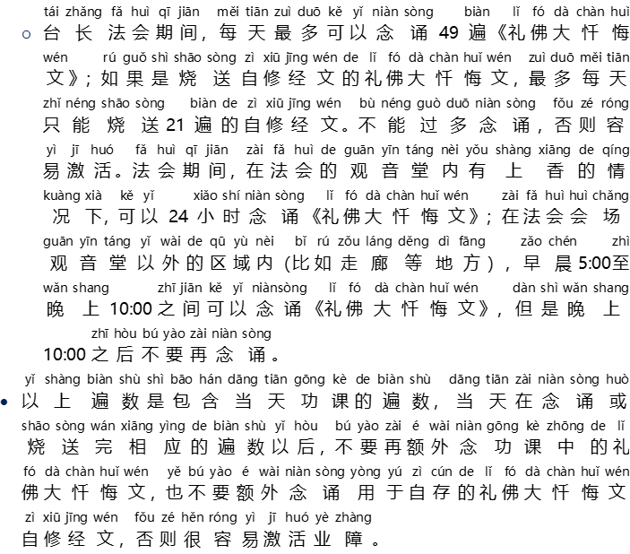 - Sewaktu Master menyelenggarakan Seminar Dharma, setiap hari boleh melafalkan maksimal 49x {Li Fo Da Chan Hui Wen}; jika membakar {Li Fo Da Chan Hui Wen} cadangan, setiap hari hanya boleh membakar maksimal 21x {Li Fo Da Chan Hui Wen}. Tidak boleh melafalkan melebihi jumlah yang ditentukan, jika tidak maka buah karma buruk akan datang dengan cepat. Sewaktu Seminar Dharma, di dalam Guan Yin Tang yang berada di dalam gedung Seminar dan dengan keadaan dupa masih menyala, boleh melafalkan {Li Fo Da Chan Hui Wen} selama 24 jam; bila berada di bagian lain dalam gedung Seminar (seperti di lorong atau tempat lainnya), mulai dari pukul 5 pagi sampai pukul 10 malam boleh melafalkan {Li Fo Da Chan Hui Wen}, tetapi tidak boleh lewat dari pukul 10 malam.