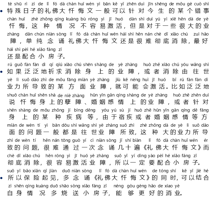 - Pelafalan {Li Fo Da Chan Hui Wen} ini sebaiknya ditujukan khusus untuk menyesali dan meminta maaf atas suatu kesalahan yang dilakukan di kehidupan ini, seperti menusuk atau mengerjai orang dari belakang, pernah melihat buku-buku atau video yang kurang baik dan lainnya. Setelah selesai melafalkan {Li Fo Da Chan Hui Wen} yang ditujukan khusus untuk suatu hal, lalu bertobat dengan tulus, maka bisa langsung menghapus karma buruk Anda, dan tidak perlu khawatir buah karma buruk tersebut akan teraktivasi, maka dalam keadaan seperti ini tidak perlu dibarengi dengan membakar Xiao Fang Zi. Jika tidak ditujukan untuk menyesali hal-hal tertentu, boleh mengucapkan: “Mohon Guan Shi Yin Pu Sa yang Maha Welas Asih memberkati saya XXX (nama sendiri), menguraikan hubungan buruk dan menghapuskan karma buruk saya.”