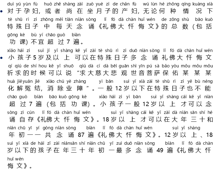 - Anak kecil yang berumur 5 tahun atau lebih, boleh melafalkan lebih banyak paritta {Li Fo Da Chan Hui Wen} di hari-hari raya khusus, sebelum melafalkan boleh memohon: “Mohon Guan Shi Yin Pu Sa yang Maha Welas Asih memberkati saya XXX menguraikan hubungan buruk, dan menghapuskan karma buruk”. Biasanya anak berumur di bawah 12 tahun pada hari besar ini tetap tidak boleh melafalkan lebih dari 7x (termasuk PR harian di hari itu). Anak yang berumur 12 tahun ke atas baru boleh membuat paritta cadangan {Li Fo Da Chan Hui Wen}. Anak yang berumur 18 tahun ke atas baru boleh melafalkan 87x {Li Fo Da Chan Hui Wen} di malam tahun baru Imlek dan di hari Imlek. Anak yang berumur di antara 12 sampai 18 tahun, boleh melafalkan maksimal 49x {Li Fo Da Chan Hui Wen} di malam tahun baru Imlek dan di hari Imlek.