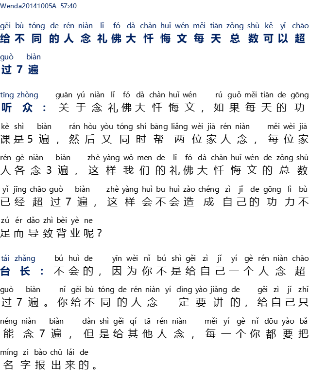 Melafalkan Lǐ Fó Dà Chàn Huǐ Wén untuk orang yang berbeda, jumlahnya boleh melebihi 7 kali sehari 给不同的人念礼佛大忏悔文每天总数可以超过7遍