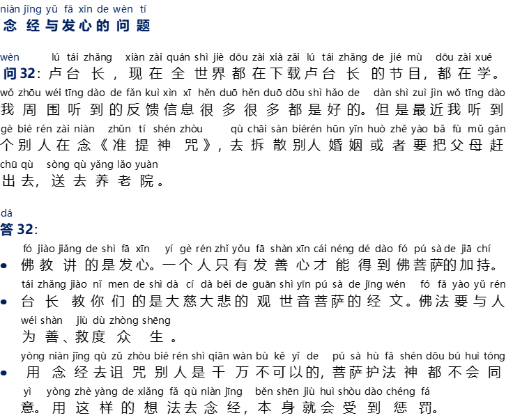 Tanya [32]: Master Lu, sekarang semua orang di seluruh dunia sedang mengunduh rekaman program Anda dan mempelajari Xin Ling Fa Men. Semua tanggapan orang di sekitar saya sangat positif. Namun, belakangan ini saya mendengar ada beberapa orang melafalkan {Zhun Ti Shen Zhou} untuk membuat orang lain bercerai atau mengusir orang tua mereka keluar dari rumah dan membawa mereka ke panti jompo.