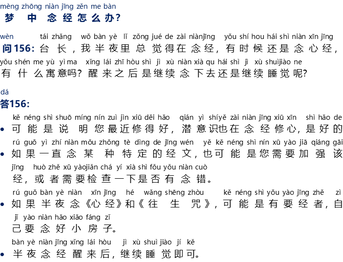 Tanya [156]: Master, saya selalu bermimpi melafalkan paritta saat tidur di malam hari, terkadang malah melafalkan {Xin Jing}, apa arti mimpi ini? Bila saya terbangun, apakah saya harus melanjutkan melafalkan paritta atau melanjutkan tidur saya?