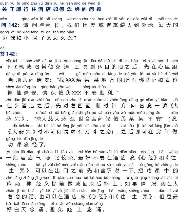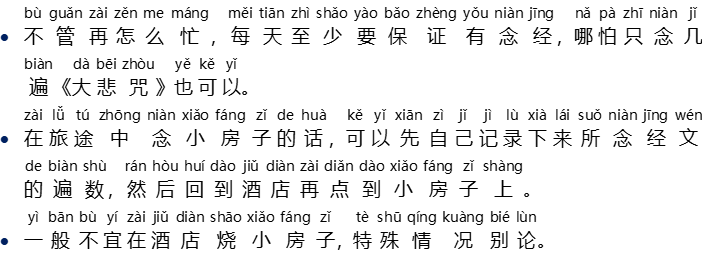 - Biasanya medan aura sebuah hotel lebih rumit, sebaiknya jangan melafalkan {Xin Jing} dan {Wang Sheng Zhou} di dalam hotel, sebelum berangkat boleh memohon kepada Bodhisattva, supaya kedua paritta ini bisa dilafalkan sebelum berangkat atau setelah pulang ke rumah. Jika memang dalam keadaan terpaksa, boleh melafalkan {Xin Jing} dan {Wang Sheng Zhou} di dalam hotel, tetapi sebaiknya di waktu pagi atau siang hari, hindari untuk melafalkannya di malam hari.