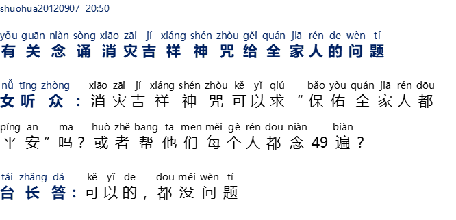 Pendengar wanita: Bolehkah paritta Xiao Zai Ji Xiang Shen Zhou untuk memohon “berkat keselamatan untuk seluruh anggota keluarga”? Atau membantu mereka masing-masing melafalkan 49 kali?