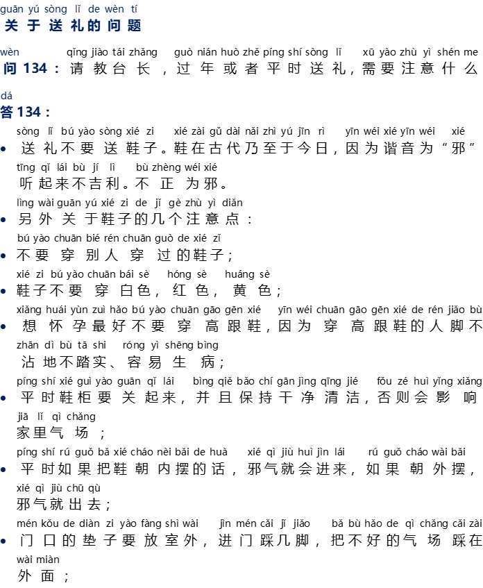 - Jangan memberi hadiah berupa sepatu, dalam mandarin sepatu – “xie zi”, memiliki pelafalan yang sama dengan “xie” yang berarti sesat. Oleh karena itu, sepatu dalam tradisi secara turun-menurun disamakan dengan “xie – sesat”. “Tidak benar” berarti “sesat”, kedengarannya sangat tidak bagus.