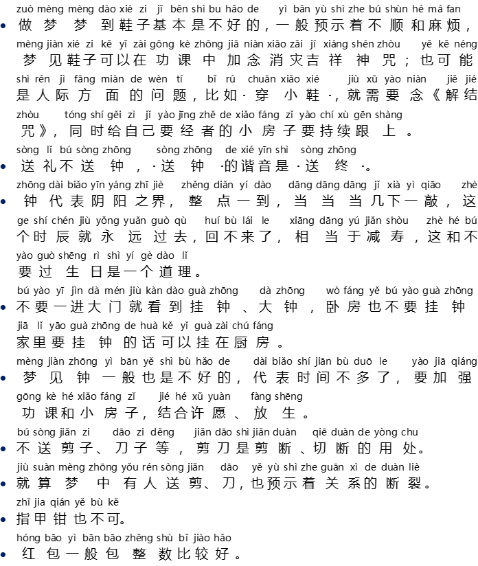 - Jika Anda bermimpi tentang sepatu biasanya pertanda buruk, menandakan adanya ketidaklancaran dan kesulitan, bila bermimpi seperti ini, tambahkan pelafalan {Xiao Zai Ji Xiang Shen Zhou} dalam PR harian; jika masalah yang timbul berasal dari hubungan dengan orang lain, seperti “chuan xiao xie”– dipersulit orang lain, perlu melafalkan {Jie Jie Zhou}, serta terus melafalkan Xiao Fang Zi untuk penagih hutang karma sendiri.