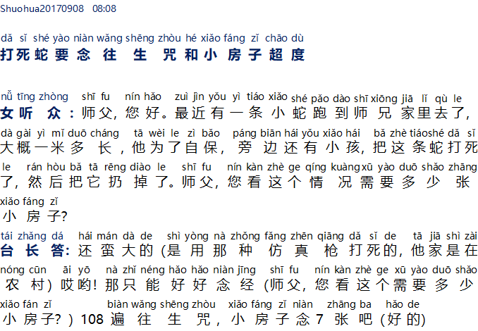 Master menjawab: Lumayan besar ularnya (dibunuh dengan senjata simulasi semacam itu, rumahnya ada di pedesaan) aduh! Jadi, hanya bisa melafalkan paritta dengan baik (Master, menurut Anda ini perlu melafalkan berapa banyak XFZ?) 108 kali mantra Wang Sheng Zhou, XFZ 7 lembar (Baik)