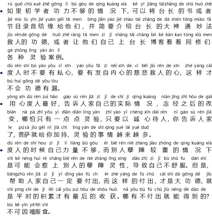• Saat memperkenalkan Dharma pada orang lain, jangan ada pemikiran egois, harus dengan tulus berwelas asih menyelamatkan orang lain, dengan demikian jasa kebajikan yang ditanam tidak bercela.