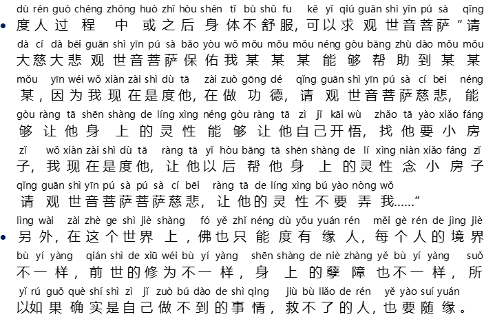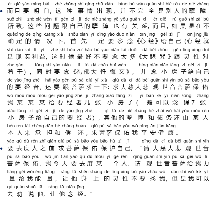 • Dan Anda harus mengerti, bisa muncul hal seperti ini, tidak sepenuhnya dikarenakan karma buruk orang tersebut, mungkin saja masalah ini juga berhubungan dengan karma buruk kita sendiri, dan juga jika Anda tidak mengetahui penyebab yang benar, pertama harus melafalkan {Xin Jing} lebih banyak untuk diri sendiri ({Xin Jing} adalah suatu keuntungan yang nyata, saat ini sebaiknya jangan terlalu banyak melafalkan {Da Bei Zhou} dan melawan arwah tersebut), selain itu juga harus melafalkan {Li Fo Da Chan Hui Wen}, dan Xiao Fang Zi untuk penagih hutang karma sendiri, dan memohon kepada Bodhisattva: “Mohon Guan Shi Yin Pu Sa yang Maha Welas Asih memberkati saya XXX untuk memberikan penagih hutang karma saya N lembar Xiao Fang Zi” (N, biasanya boleh melafalkan 7 lembar Xiao Fang Zi untuk penagih hutang karma sendiri), karma buruk dan hutang karma lainnya akan ditanggung dan dibayar oleh orang itu sendiri, mohon Bodhisattva memberkati saya dengan keselamatan dan kesehatan.