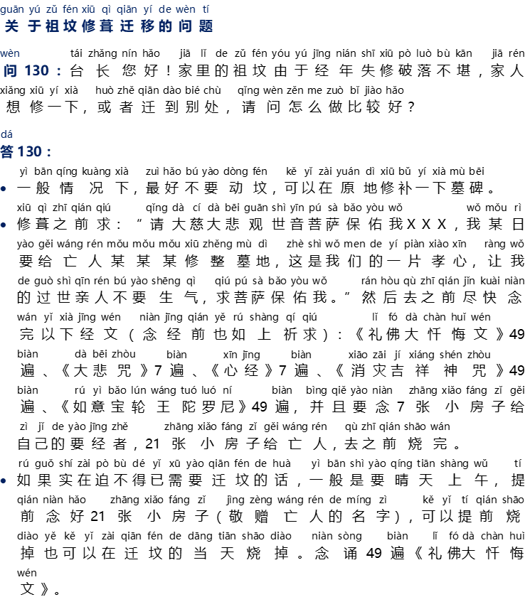 - Sebelum memugar makam, bisa mengucapkan permohonan: “Mohon Guan Shi Yin Pu Sa yang Maha Welas Asih memberkati saya XXX, saya di hari YY ingin memugar makam dari ZZZ, ini adalah bentuk rasa bakti kami kepadanya, mohon leluhur yang sudah meninggal jangan marah, mohon Guan Shi Yin Pu Sa memberkati saya.” Lalu sebelum pergi ke makam, lafalkan paritta berikut (ucapkan permohonan yang sama seperti di atas sebelum melafalkan paritta): 49x {Li Fo Da Chan Hui Wen}, 7x {Da Bei Zhou}, 7x {Xin Jing}, 49x {Xiao Zai Ji Xiang Shen Zhou}, 49x {Ru Yi Bao Lun Wang Tuo Luo Ni}, lafalkan 7 lembar Xiao Fang Zi untuk penagih hutang karma sendiri dan 21 lembar Xiao Fang Zi yang ditujukan untuk orang yang sudah meninggal (orang yang dimakamkan), dan bakar semua Xiao Fang Zi sebelum berangkat memugar makam.