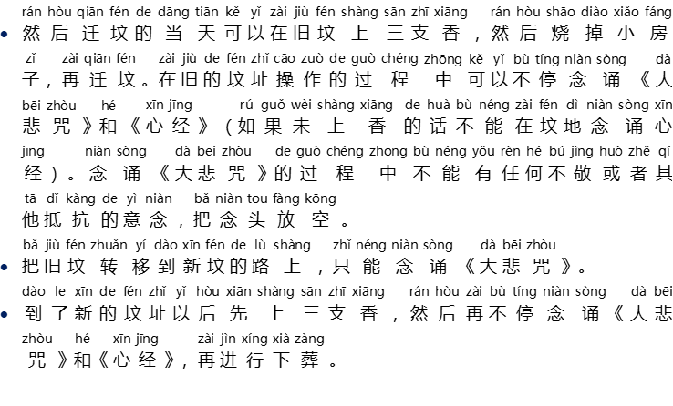 - Di hari memindahkan makam, nyalakan dan pasang 3 batang dupa di makam yang lama, lalu membakar Xiao Fang Zi, baru memindahkan makam. Saat mulai menggali makam yang lama, harus terus melafalkan {Da Bei Zhou} dan {Xin Jing} (jika belum menyalakan dupa, jangan melafalkan {Xin Jing} di tempat pemakaman). Saat melafalkan {Da Bei Zhou}, tidak boleh ada pemikiran tidak hormat atau pikiran untuk melawan (arwah asing), kosongkan pikiran Anda.