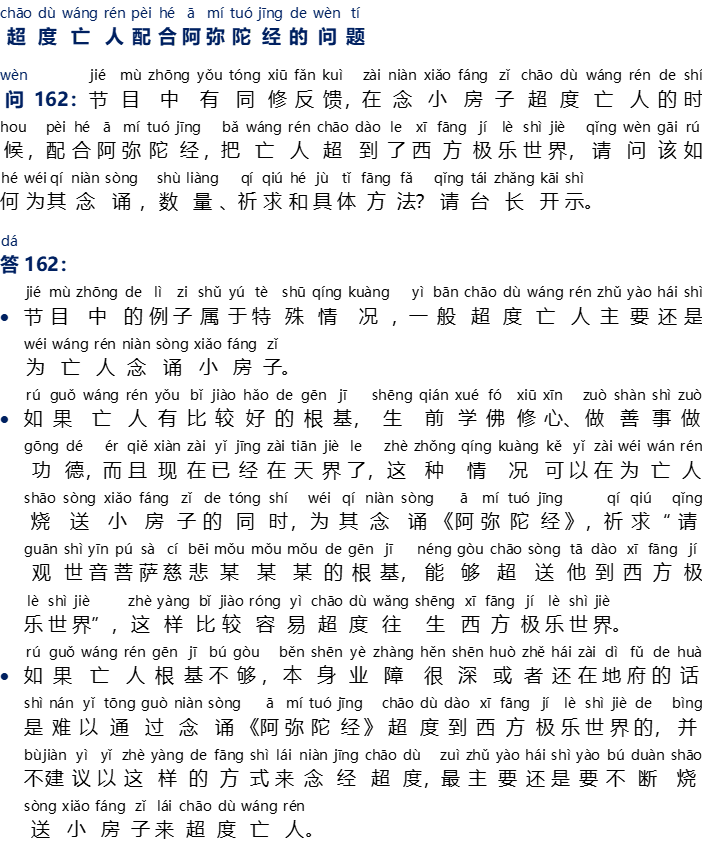 Tanya [162]: Dalam siaran radio ada teman se-Dharma yang bertanya, saat melafalkan Xiao Fang Zi untuk mendoakan almarhum (orang yang sudah meninggal), bila ditambah dengan melafalkan {A Mi Tuo Jing}, maka arwah orang tersebut bisa pergi ke Alam Sukhavati, mohon tanya, bagaimana cara melafalkannya, jumlah pelafalan, cara memohon dan tata cara lainnya? Mohon petunjuk dari Master.