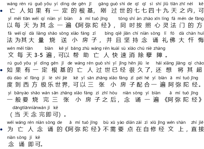 - Jika orang yang meninggal tersebut sudah memiliki dasar spiritual tertentu untuk mencapai Kebuddhaan, maka dalam masa 49 hari setelah dia meninggal, boleh melafalkan setiap hari 1x paritta {A Mi Tuo Jing} baginya, selain itu, seperti tata cara dalam Xin Ling Fa Men, membakarkan Xiao Fang Zi untuknya dalam jumlah yang banyak, dan melafalkan 3-5x {Li Fo Da Chan Hui Wen} untuknya setiap hari, cara ini bisa membantu orang yang meninggal untuk menghapuskan karma buruknya dengan lebih cepat.