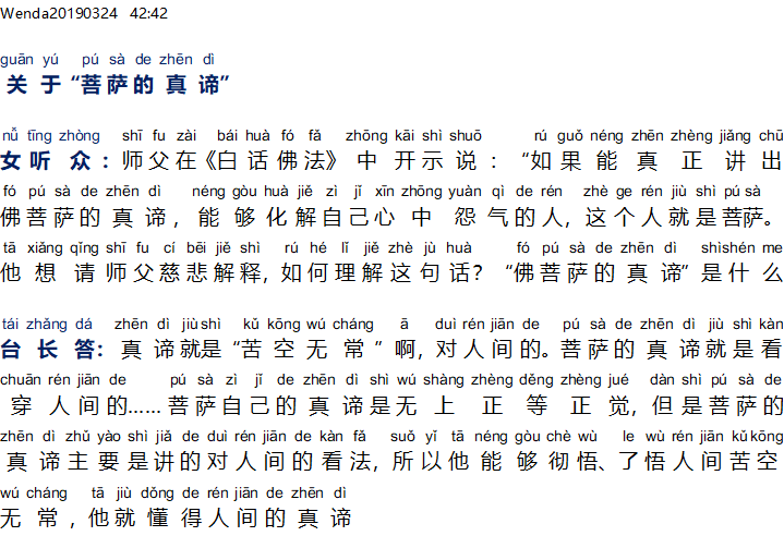 Master menajwab: Makna/inti sebenarnya (kebenaran) adalah “ketidakkekalan”, terhadap duniawi. Kebenaran Bodhisattva adalah bisa melihat dengan jelas duniawi … kebenaran Bodhisattva itu sendiri adalah penerangan sempurna, tapi kebenaran Bodhisattva diutamakan pada pandangan terhadap duniawi, maka dia bisa menyadari dengan sepenuhnya, telah menyadari ketidakkekalan duniawi, maka dia bisa memahami kebenaran dari duniawi ini.