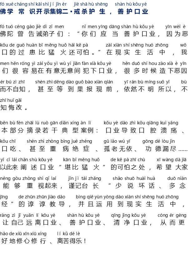 Bagian ini mengutip beberapa kasus khusus: karma ucapan mengakibatkan sariawan, gagap, bahkan penyakit-penyakit kritis, kesepian dan tiada yang bisa diandalkan di hari tua, serta kebocoran jasa kebajikan …. Dengan ini dapat dijelaskan bahwa karma ucapan lebih mengerikan dibanding dengan api yang ganas, berharap semua orang bisa memperhatikannya. Ingatlah nasihat Master “Kurangi berbicara yang buruk dan perbanyak melafalkan paritta”, dan terapkan dalam kehidupan nyata, agar diri sendiri dapat menjauhi karma ucapan, menjaga baik karma ucapan, memurnikan karma ucapan, sehingga dapat lebih baik dalam membina pikiran dan perilaku diri sendiri, menjauh dari penderitaan dan memperoleh kebahagiaan.