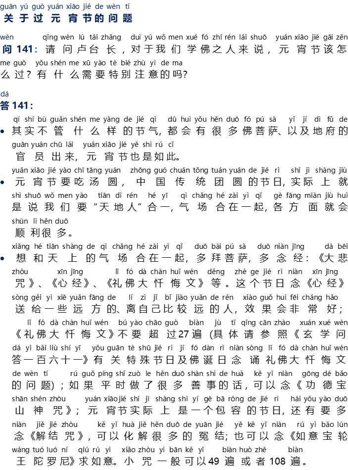 • Jika ingin menyelaraskan aura kita dengan kekuatan Langit (Surga), maka kita harus lebih sering sembahyang kepada Buddha dan Bodhisattva, dan juga lebih banyak melafalkan paritta: {Da Bei Zhou}, {Xin Jing}, {Li Fo Da Chan Hui Wen} dan paritta lainnya. Melafalkan {Xin Jing} pada hari ini untuk orang-orang atau saudara yang tinggal jauh dari kita akan memiliki hasil pelafalan yang lebih baik; jangan melafalkan {Li Fo Da Chan Hui Wen} lebih dari 27x (silakan membaca {Tanya Jawab Seputar Dharma} No. 161 mengenai “Melafalkan [Li Fo Da Chan Hui Wen] di Hari Raya Khusus & Hari Kelahiran Para Buddha”; jika biasanya Anda sudah sering melakukan kebajikan, maka boleh melafalkan {Gong De Bao Shan Shen Zhou}; Cap Go Meh sebenarnya adalah hari raya yang penuh toleransi, maka boleh melafalkan lebih banyak {Jie Jie Zhou}, untuk mengurai banyak hubungan karma buruk; juga boleh melafalkan {Ru Yi Bao Lun Wang Tuo Luo Ni} untuk memohon agar keinginan kita terkabul. Paritta-paritta pendek biasanya boleh dilafalkan sebanyak 49x atau 108x.