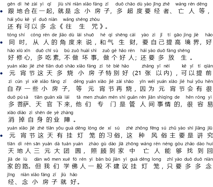• Pada hari raya Cap Go Meh sangat bagus sekali untuk membakar lebih banyak Xiao Fang Zi (tidak lebih dari 21 lembar), boleh mempersiapkan lebih banyak Xiao Fang Zi cadangan sebelumnya, lalu dibakar sekaligus pada hari Cap Go Meh, karena pada hari tersebutada banyak Bodhisattva dan Pejabat Surga yang turun ke dunia, mereka khusus menangani permasalahan duniawi, jadi akan lebih mudah untuk menghapus karma buruk diri sendiri.