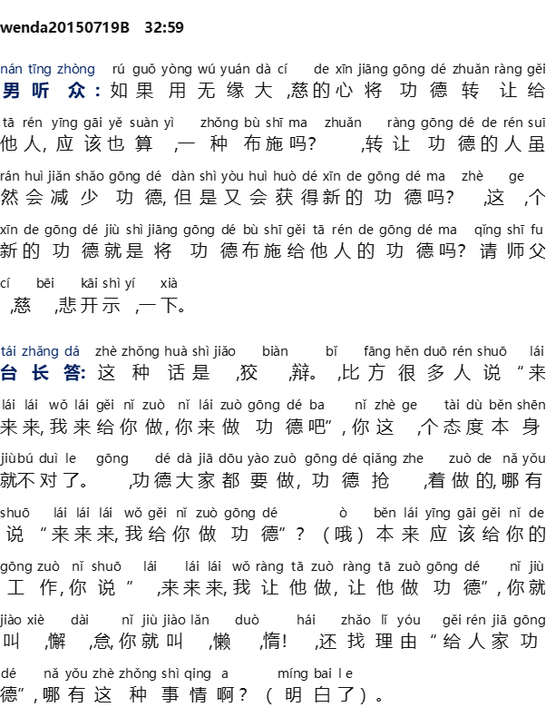 Pendengar pria: Jika menggunakan hati yang welas asih untuk merelakan jasa kebajikan kepada orang lain, apakah ini juga termasuk semacam amal? Orang yang merelakan jasa kebajikan mungkin akan mengurangi jasa kebajikannya, apakah dia akan mendapatkan jasa kebajikan yang baru? Apakah jasa kebajikan yang baru ini merupakan jasa kebajikan yang diberikan kepada orang lain? Mohon Master welas asih memberikan wejangan.