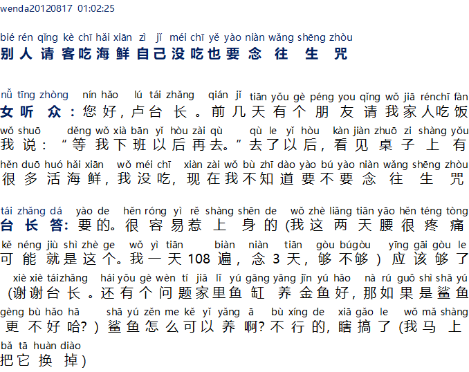Pendengar wanita: Halo, Master Lu. Beberapa hari yang lalu, ada seorang teman mengundang keluarga saya untuk makan. Saya berkata, “Tunggu saya pulang kerja baru pergi.” Setelah pergi ke sana, saya melihat banyak makanan laut hidup (life seafood) di atas meja. Saya tidak memakannya. Sekarang saya tidak tahu apakah saya harus melafalkan mantra Wang Sheng Zhou?