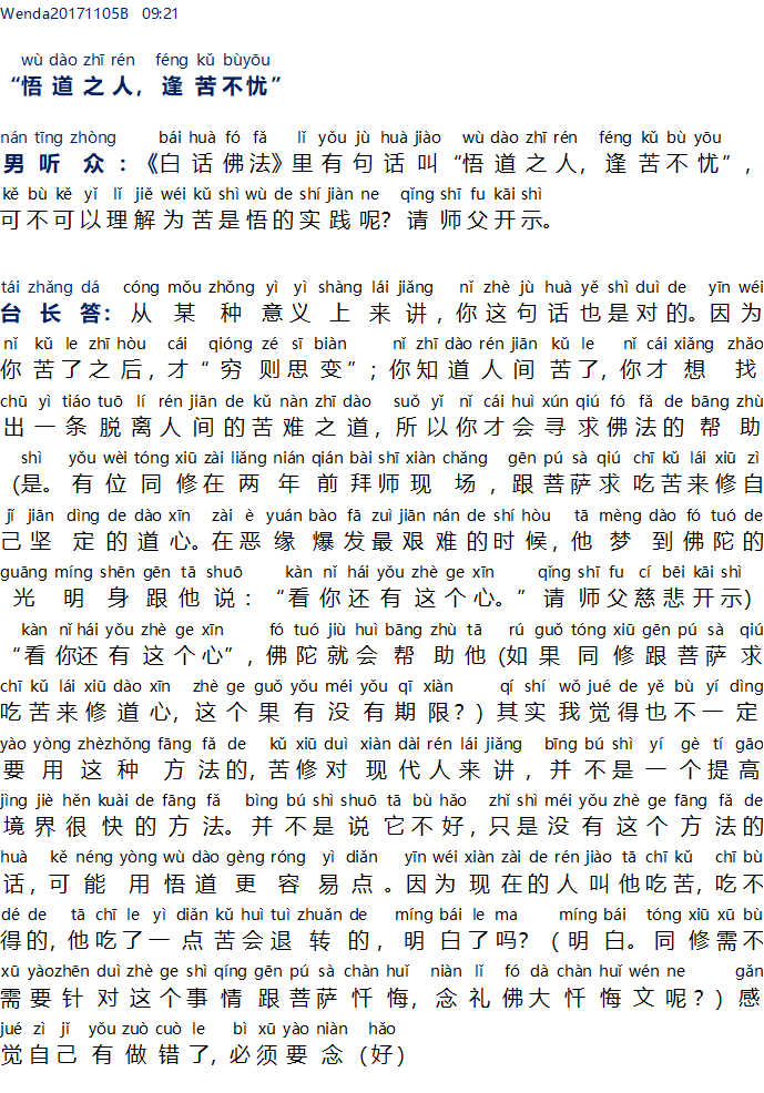 Pendengar Pria: di《 Bai Hua Fo Fa 》 ada sebuah kalimat “Orang yang tercerahkan, saat mengalami penderitaan tidak akan khawatir ” , apakah dapat dipahami bahwa penderitaan adalah praktek dari tercerahkan? Mohon Master berikan wejangan.
