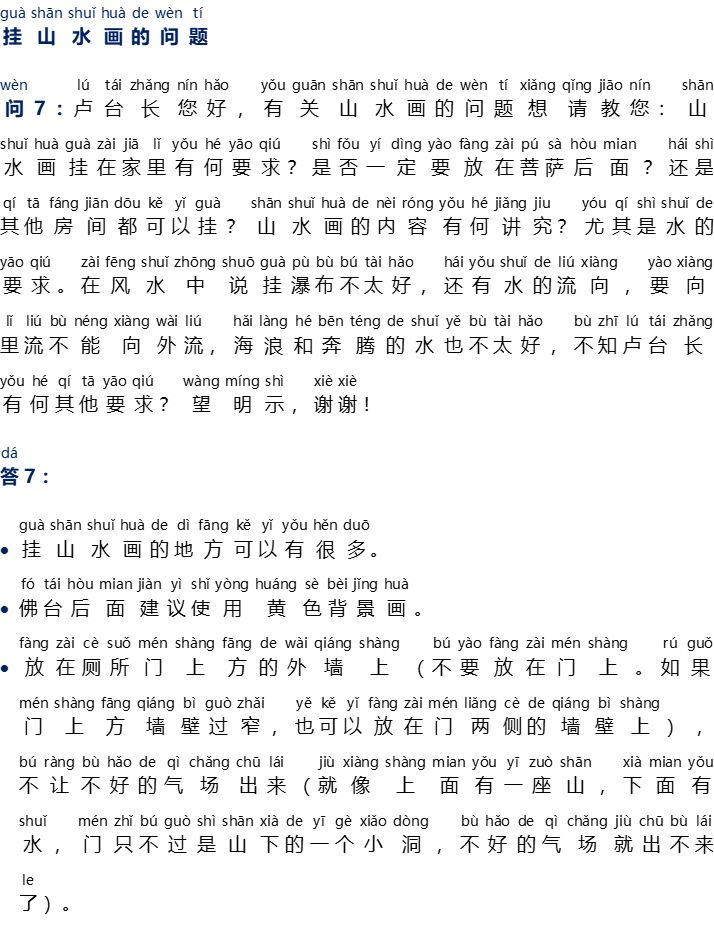 Tanya [7]: Master Lu, kami ingin meminta saran Anda mengenai gambar pemandangan alam: Apa persyaratan untuk menempatkan gambar pemandangan alam? Apakah harus ditempatkan di belakang rupang atau gambar Buddha atau Bodhisattva? Atau boleh digantung di ruangan lain? Apakah makna dari gambar ini, terutama air dalam lukisan? Menurut feng shui, menggantung gambar air terjun kurang bagus, dan ke mana arah airnya mengalir juga sangat penting, harus ke dalam tidak boleh keluar. Gambar ombak dan air yang deras juga kurang bagus, Master Lu, apakah masih ada persyaratan lainnya? Mohon sarannya. Terima kasih banyak.