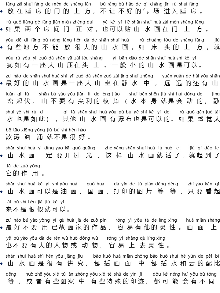 • Sesungguhnya, banyak sekali faktor yang mempengaruhi kualifikasi gambar pemandangan alam, di antaranya perbandingan air dan awan di dalam gambar, atau beberapa cap dan motif tertentu yang terdapat dalam gambar, semua ini bisa membentuk medan aura yang berbeda, selain itu gambar yang sudah diberkati baru bisa memberikan efek yang baik. Oleh karena itu, sebaiknya menggunakan gambar pemandangan alam biru yang sudah diberkati.