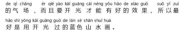 • Gambar pemandangan yang paling baik adalah sebuah gunung besar yang berada di atas air yang tenang, dengan lembah dan bukit-bukit yang jauh sebagai latar belakang, tetapi gunung tidak boleh berpuncak lancip atau tajam (air pada dasarnya selalu mengalir, air yang tenang juga mengalir), gambar pemandangan alam lainnya dengan air terjun juga boleh, tetapi jika air terjunnya terlihat terlalu deras, maka juga tidak terlalu bagus.