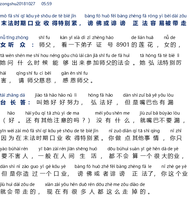 Zongshu20181027   05:59 – Pengawasan Karma Ucapan di Zaman akhir Kemerosotan Dharma sangatlah ketat, memfitnah Buddha atau