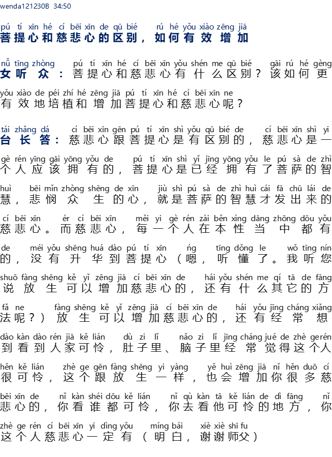 Master menjawab : Melepaskan mahkluk hidup dapat meningkatkan welas asih, dan sering memikirkan saat melihat orang lain sangat kasihan. Selalu berpikir bahwa orang ini sangat kasihan di dalam hati dan pikiran Anda. Ini sama seperti melepaskan makhluk hidup, juga akan meningkatkan banyak welas asihmu. Kamu melihat siapa saja merasa kasihan. Kamu melihat sisi kasihannya dia, maka kamu ini pasti memiliki hati yang welas asih.