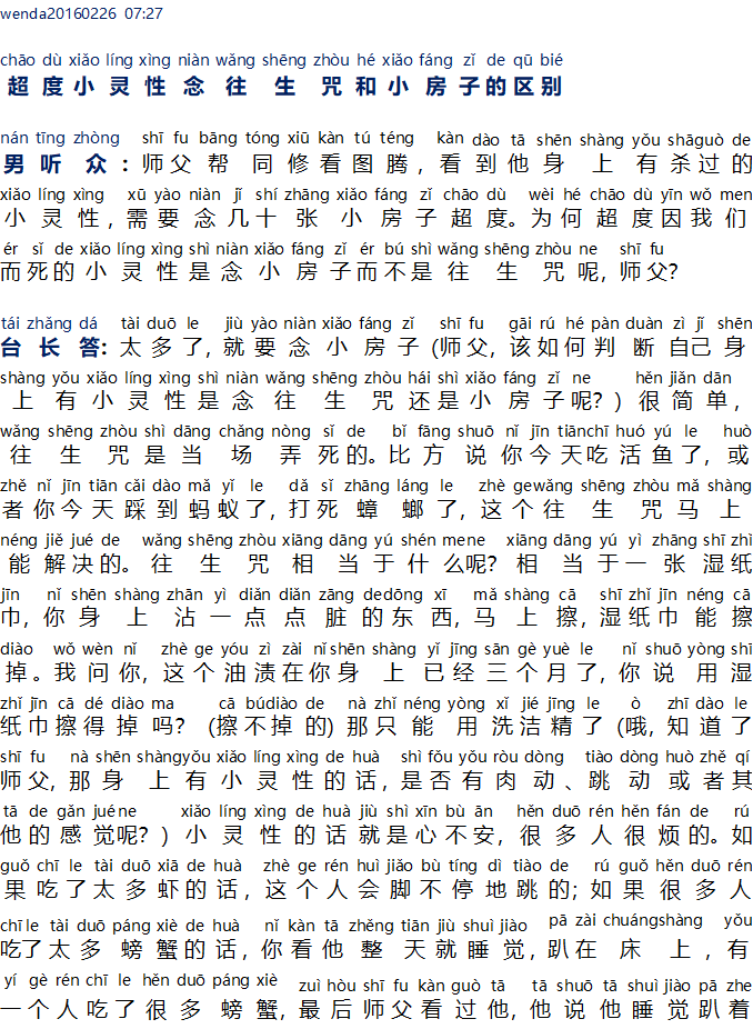 Pendengar pria: Master membantu teman se-Dharma untuk menerawang totem dan melihat bahwa ditubuhnya ada arwah asing kecil yang pernah dibunuhnya, perlu melafalkan sepuluh lebih lembar XFZ untuk mendoakan dan melintaskan mereka. Mengapa melintaskan arwah kecil yang mati karena kita harus melafalkan XFZ bukan Wang Sheng Zhou, Master?