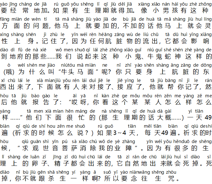 Master menjawab: Saya pikir cara ini sangat bagus (100.000 kali, apakah benar?) Boleh 100.000 kali, tetapi tergantung apakah itu melebihi tidak (tidak ada batasan jumlah yang harus dilafalkan setiap hari, bukan?) Tidak ada batas berapa kali. Seperti mantra Wang Sheng Zhou ini harus sering melafalkannya. Ingat, Master ini orangnya … kalian anak-anak ini, benar-benar seperti tidak mempunyai orang tua, terkadang ayah dan ibu kalian tidak akan memberi tahu kalian tentang hal-hal ini. Saya beri tahu kalian, kalian anak-anak ini harus mengerti, seorang gadis yang datang bulan atau menstruasi harus melafalkan mantra Wang Sheng Zhou; dan juga, jika seorang anak laki-laki yang mengalami masa pubertas, dia tumbuh dewasa, jika dia ada mimpi basah dan mengeluarkan sperma, dia harus melafalkan mantra Wang Sheng Zhou. Hal-hal semacam ini, siapa yang akan mengatakannya Hanya Master yang akan mengatakannya. Ibu dan Ayah kalian tidak akan memberi tahu kamu tentang hal-hal ini, jika mereka mengetahuinya, mereka juga tidak akan memberitahu kamu. (Ya. Master mengatakan sebelumnya bahwa bahkan jika Anda adalah seorang vegetarian, mantra Wang Sheng Zhou harus dilafalkan 21 kali setiap hari. Periode menstruasi yang baru saja Anda sebutkan tadi, apakah kita perlu menambahkan jumlah Wang Sheng Zhou…) Ya, ditambah, tambah yang banyak, sering ditambah. Jika Anda dalam masa menstruasi, Anda harus menambahkannya. Jika anak laki-laki memiliki masalah seperti ini, mereka harus menambahkannya segera, jika tidak, segera akan ada arwah asing yang merasuki tubuhnya. Ingat, karena setiap kotoran yang keluar, itu akan mempengaruhi mereka yang ada di alam bawah … yang kita sebut arwah asing kecil, hantu banteng dan dewa ular itu (oh) mengapa mereka disebut “kepala banteng dan muka kuda”? Selama ada kotoran yang keluar dari tubuh Anda, di alam bawah segera akan ada orang yang menjawabnya, meresponnya, dia akan membantu Anda untuk mencatat, lalu dia akan melaporkan: “aduh, lihat XXX (nama orang) ini bagaimana dan bagaimana.. . “Mereka Yang di alam bawah itu sangat sibuk (jadi dalam periode menstruasi ini kira-kira harus berapa kali …) 49 kali sehari (bagaimana cara permohonannya?) Jika 3 sampai 4 hari, 49 kali sehari. Saat memohon, “Mohon Guan Shi Yin Pu Sa mengikis karma buruk saya”. Karena banyak sel telur dan sperma fisiologis akan keluar, mereka akan mati saat keluar secara alami. Mati, bukankah Anda sama seperti membunuh? Jadi, harus melafalkan mantra Wang Sheng Zhou.