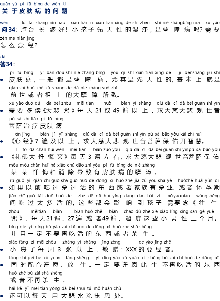 - Perlu melafalkan {Da Bei Zhou} sebanyak 21x sampai 49x atau lebih setiap harinya, dan memohon Guan Shi Yin Pu Sa untuk menyembuhkan penyakit kulit ini.