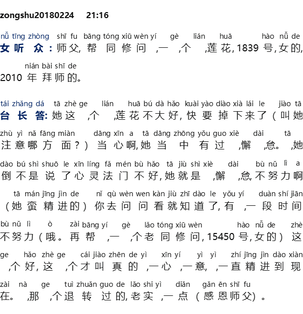 Pendengar wanita: Master, saya bantu teman se-Dharma menanyakan tentang bunga teratai. Nomor murid 1839, wanita, menjadi murid pada tahun 2010.
